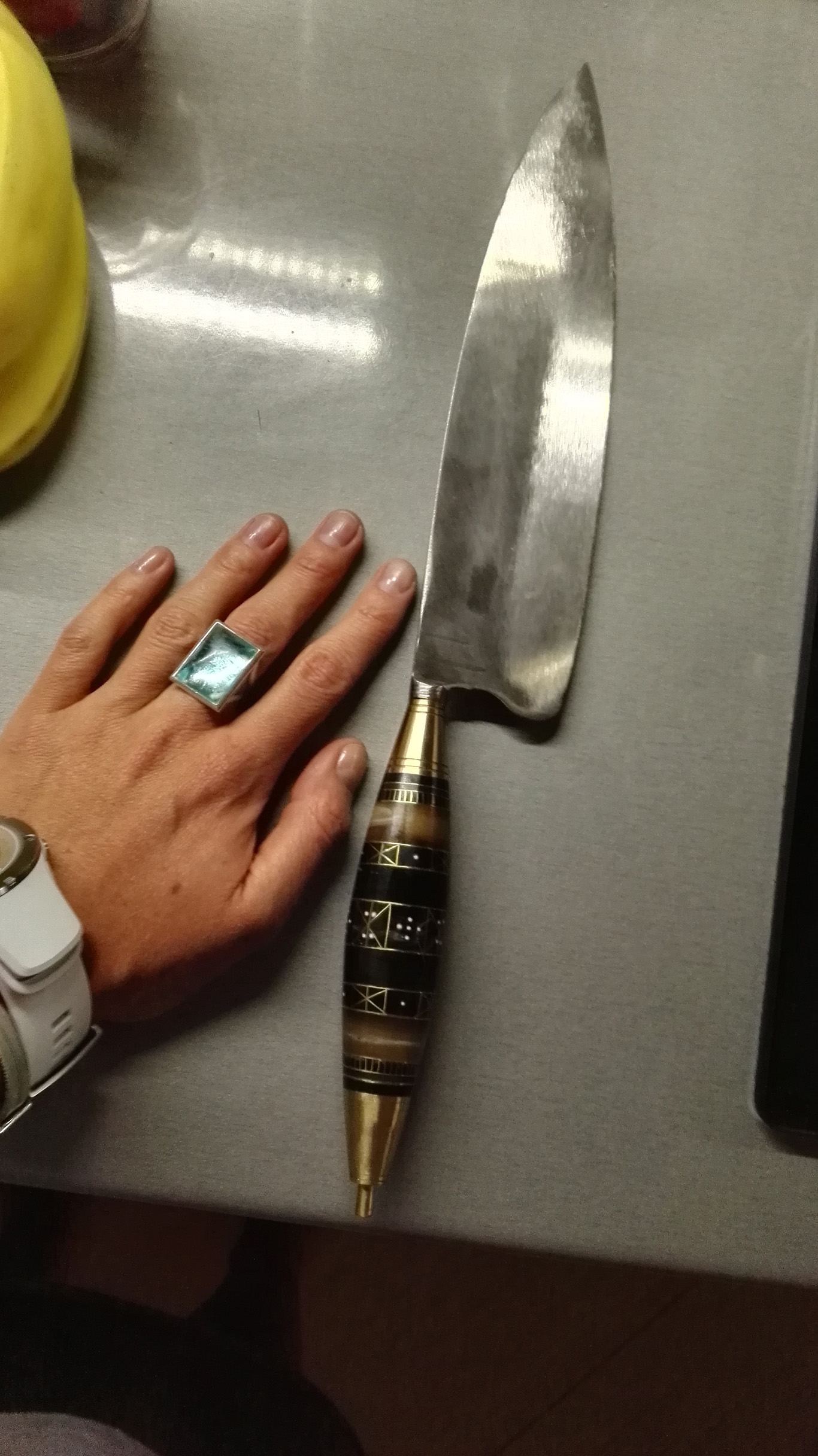 Mają zdobione rękojeści w charakterystycznym kształcie i są dość drogie. Ponoć mogą używać ich tylko mężczyźni, o czym Marcin przypomina mi za każdym razem, gdy biorę go do ręki. Milknie na zdanie: to sam potnij, komentując: “wyjątkowo ci pozwalam”.