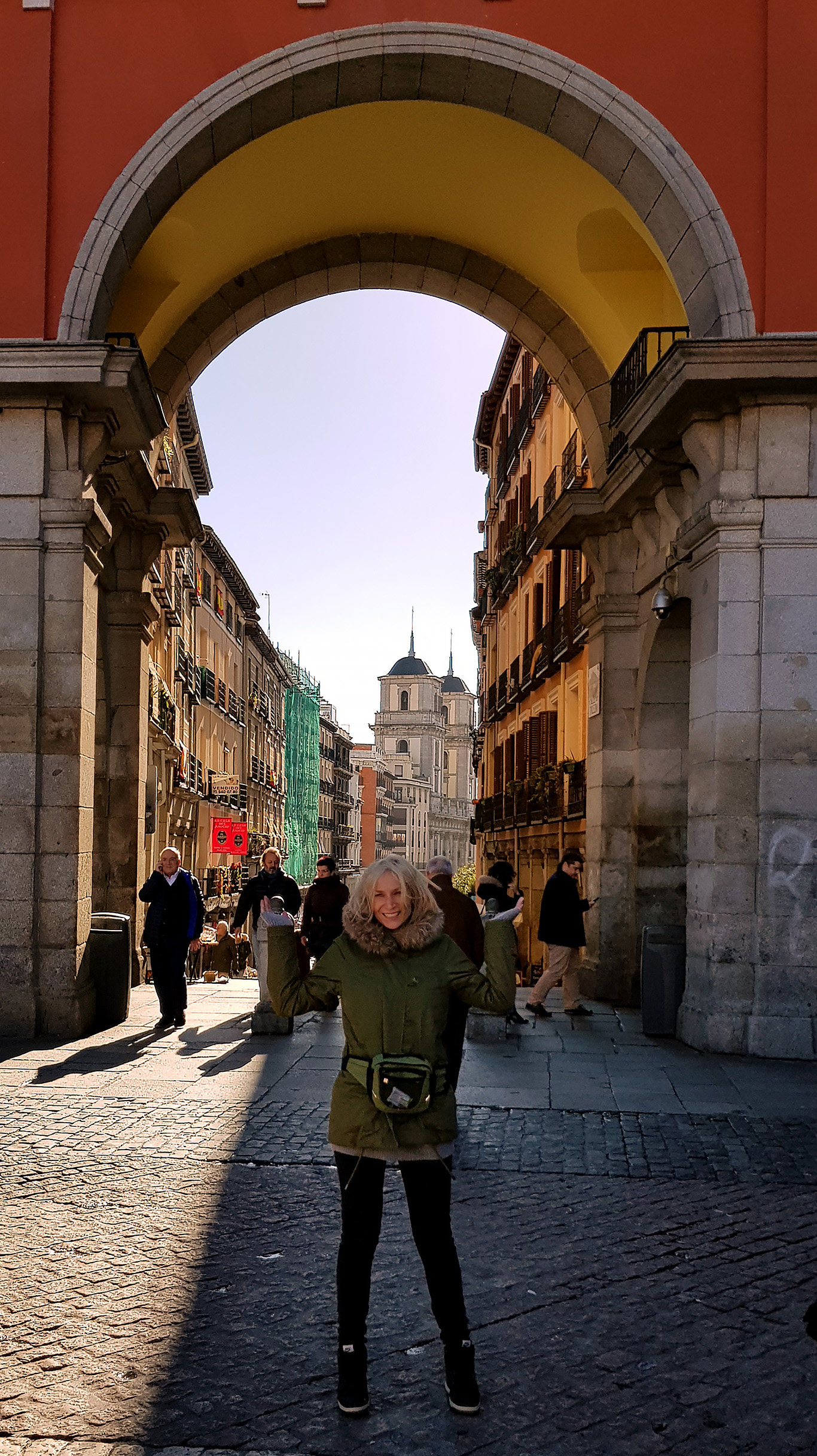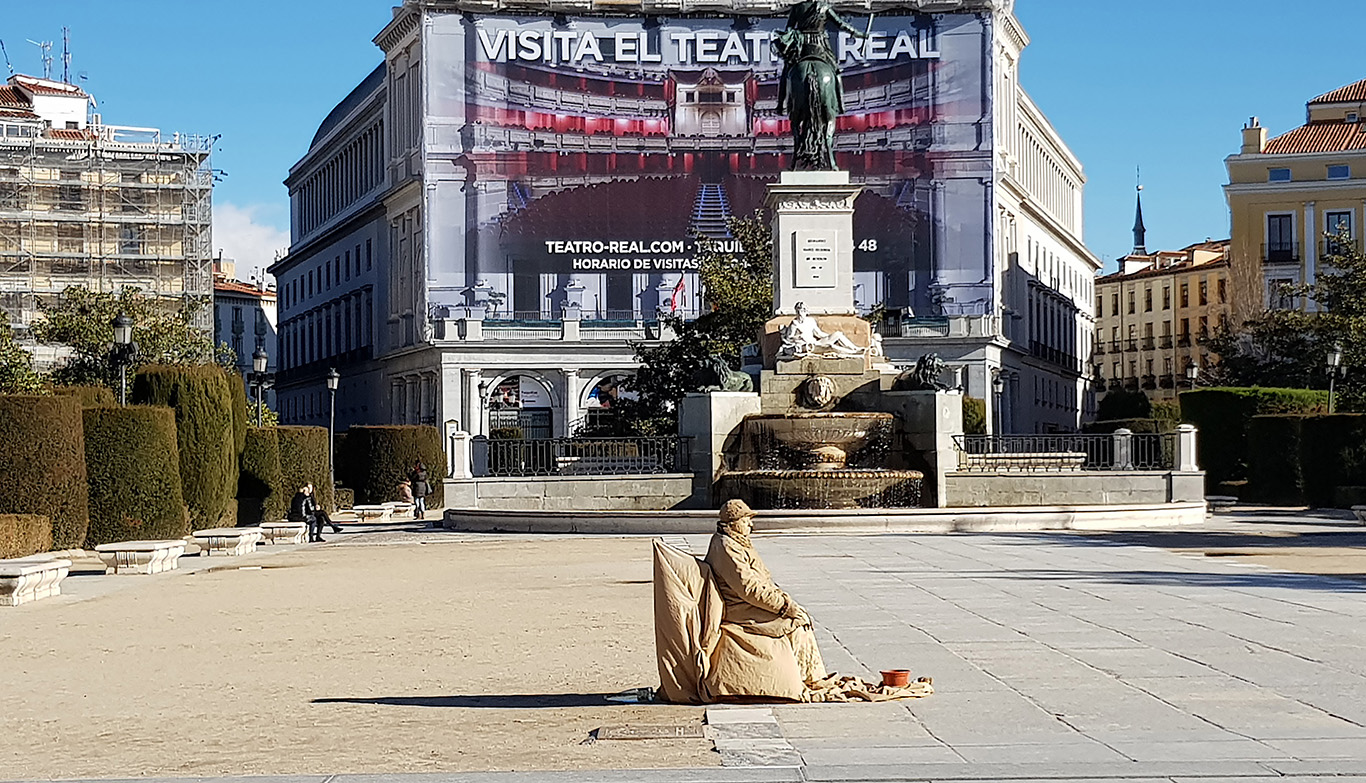 Gdyby było ciepło, pewnie siadywalibyśmy na jednym z licznych w Madrycie placów, codziennie na innym, na ławeczce albo murku, z winem, bagietką z szynką i oliwkami, i byśmy sobie siedzieli, gapiąc się na ludzi. Zwłaszcza w Hiszpanii taki sposób spędzania czasu ma sens, tak robią miejscowi, i tak właśnie jest najlepiej. Pani na poniższym zdjęciu przykładem.