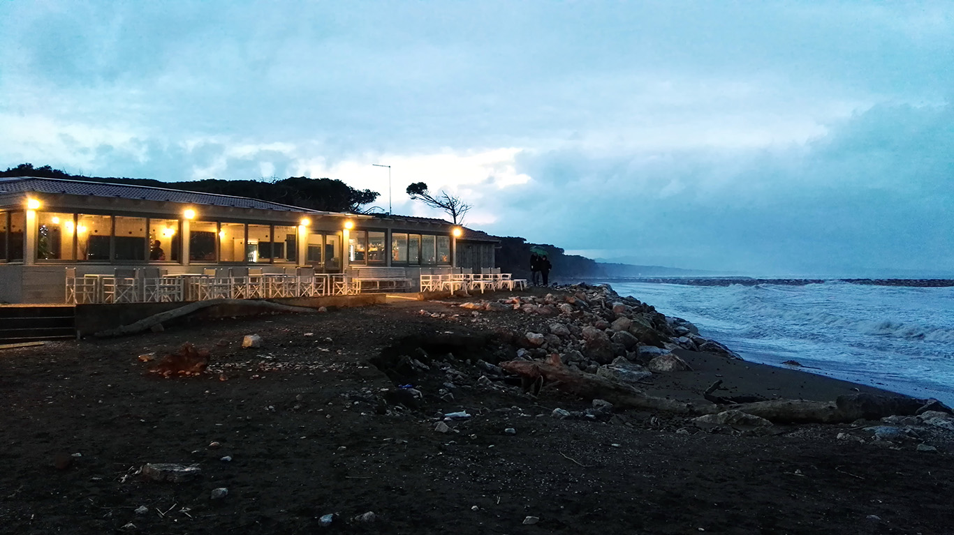 Marina di Grosseto to typowy nadmorski kurort. Pełno tu knajpeczek i barów ulokowanych w betonowych barakach wzdłuż nadmorskiej promenady, zasłaniających widok na morze – trochę dziwne rozmieszczenie, niezrozumiałe dla spacerowiczów, za to w pełni uzasadnione z perspektywy plażowiczów. Jeszcze więcej bloków, pensjonatów i mieszkań wakacyjnych. To pewnie dobry wakacyjny cel, jeśli mamy małe dzieci, ogrom sprzętu plażowego i chcemy mieć blisko do wielkiej plaży. My jednak latem byśmy się tu nie odnaleźli i nawet zimą potraktowaliśmy Marinę di Grosseto jako przystanek w drodze, akuratny do naładowania akumulatorów. Czyli poszliśmy jeść. W wyludnionym kurorcie znaleźliśmy ukrytą gdzieś w drugiej linii brzegowej ristorante, serwującą pyszne włoskie przysmaki.